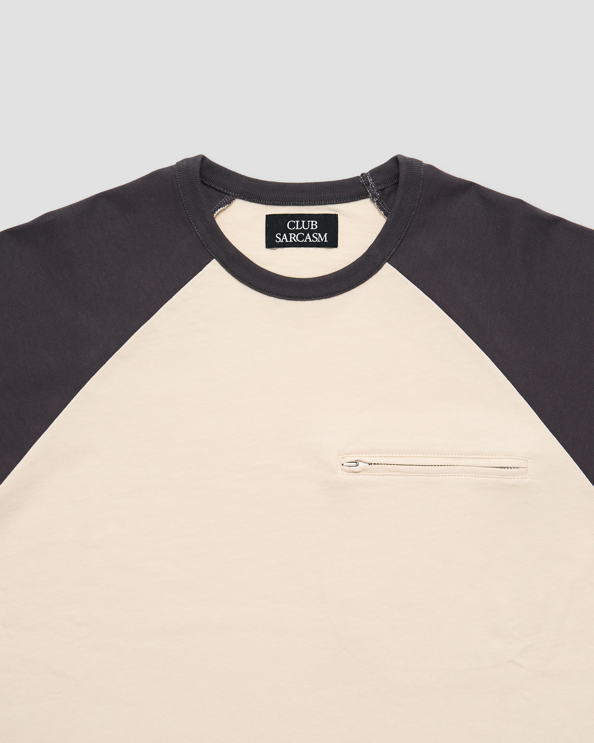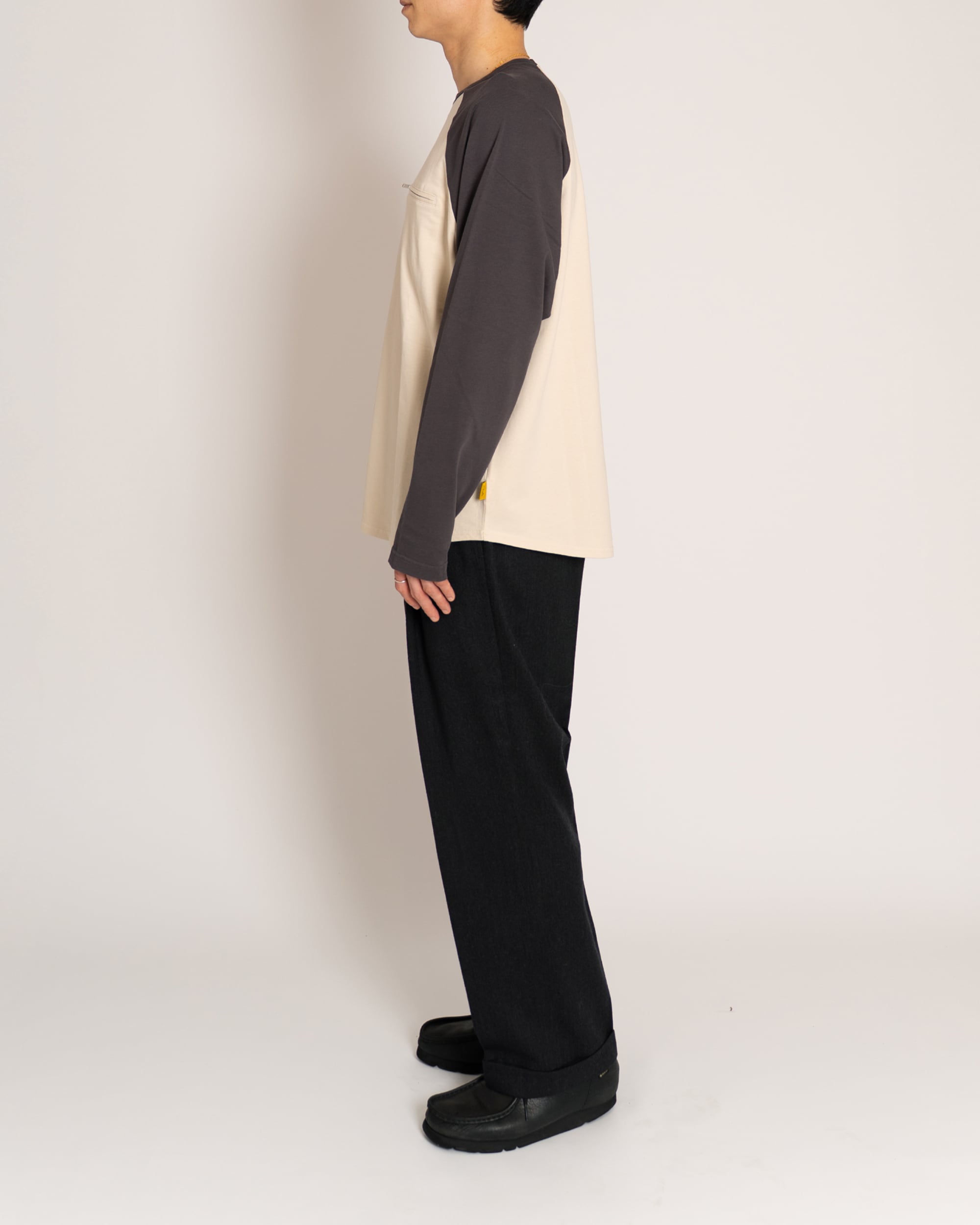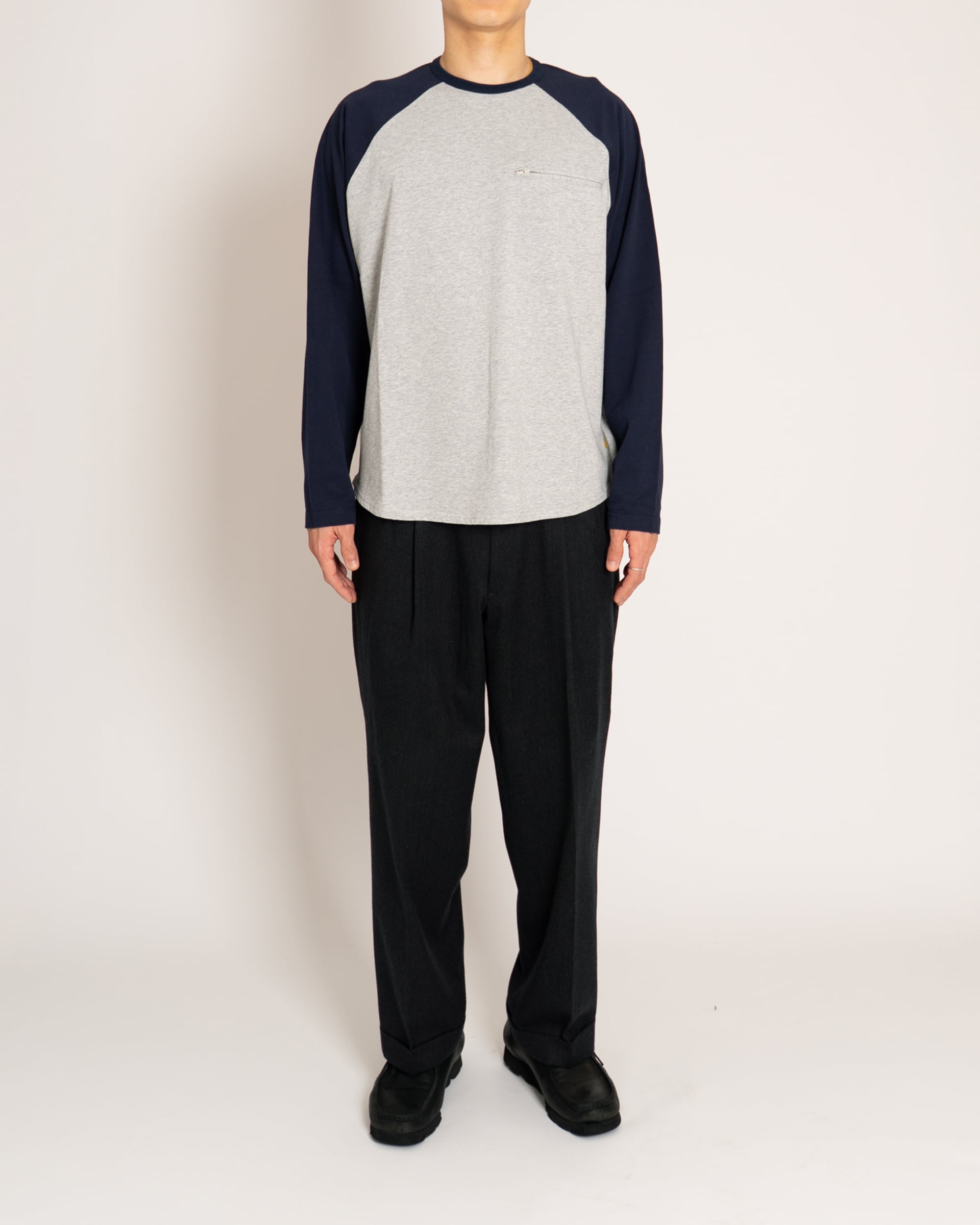 若干の光沢とハリのあるコットン素材を使用したラグランスリーブ仕様のロングスリーブTシャツ。