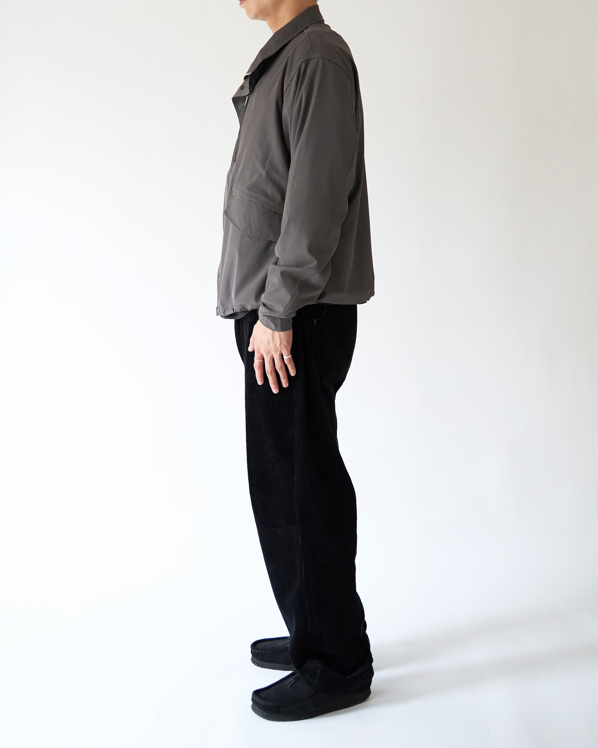 前立てはミニマルな比翼仕立てにし、胸元にはシルバーのジップポケットを配置。