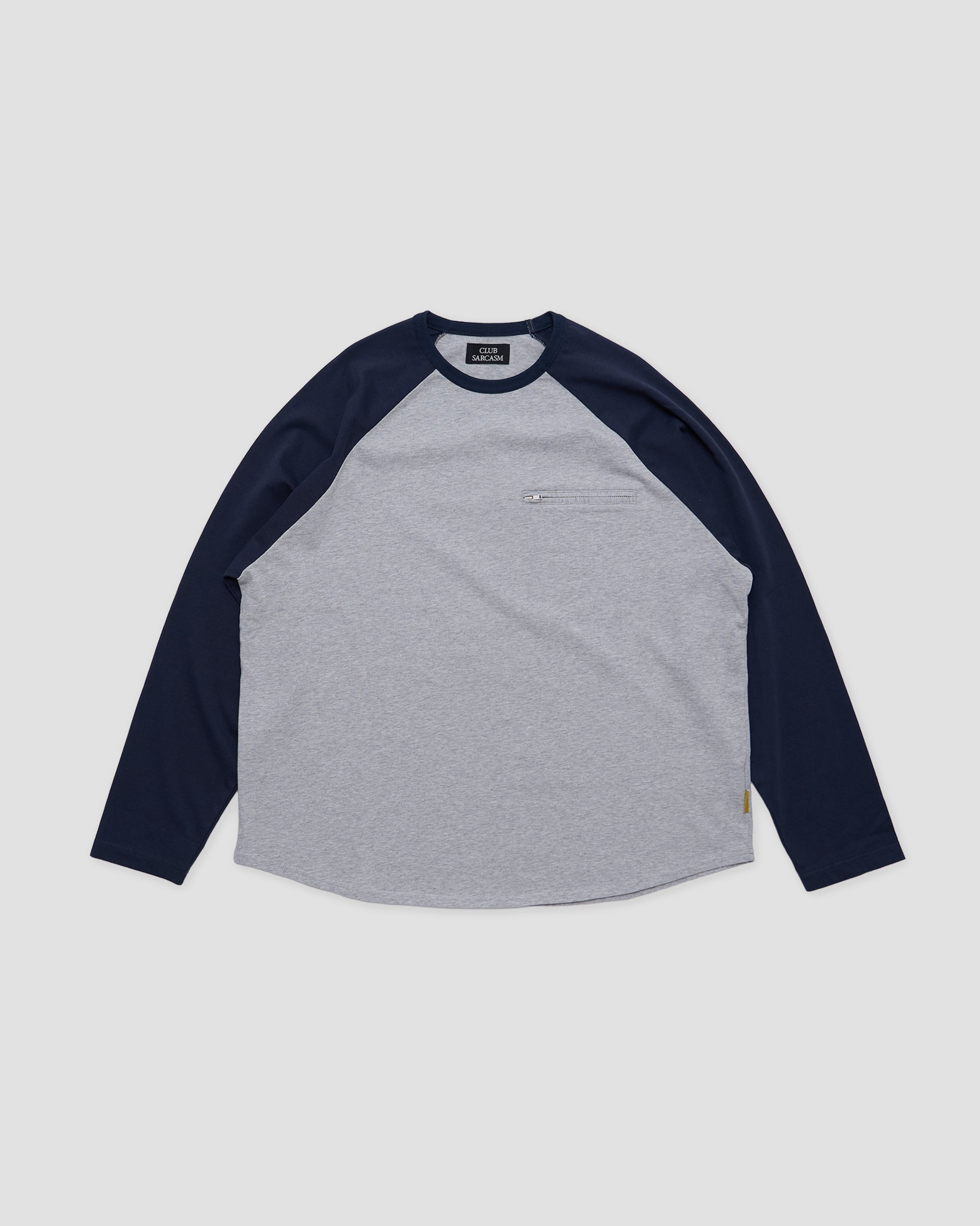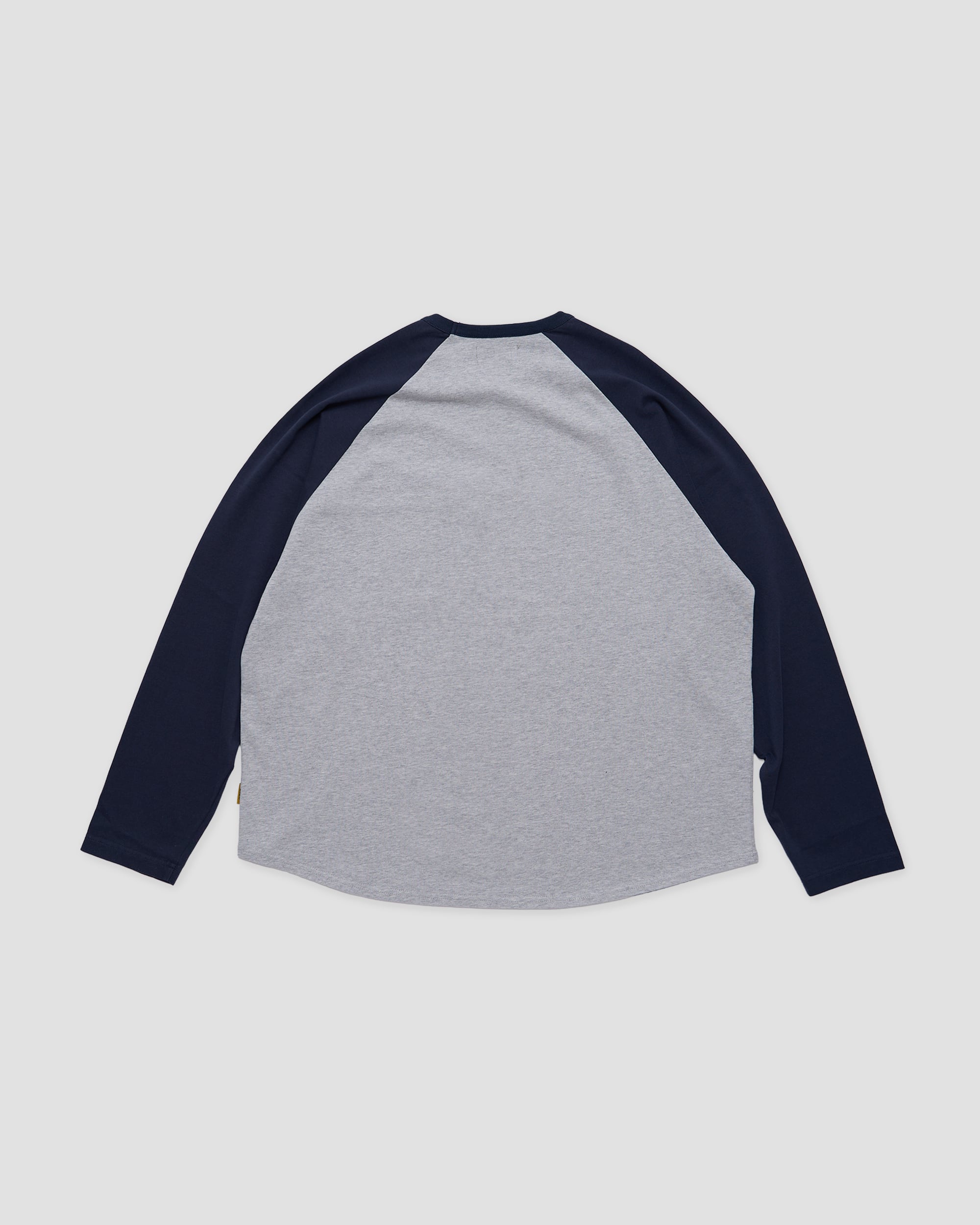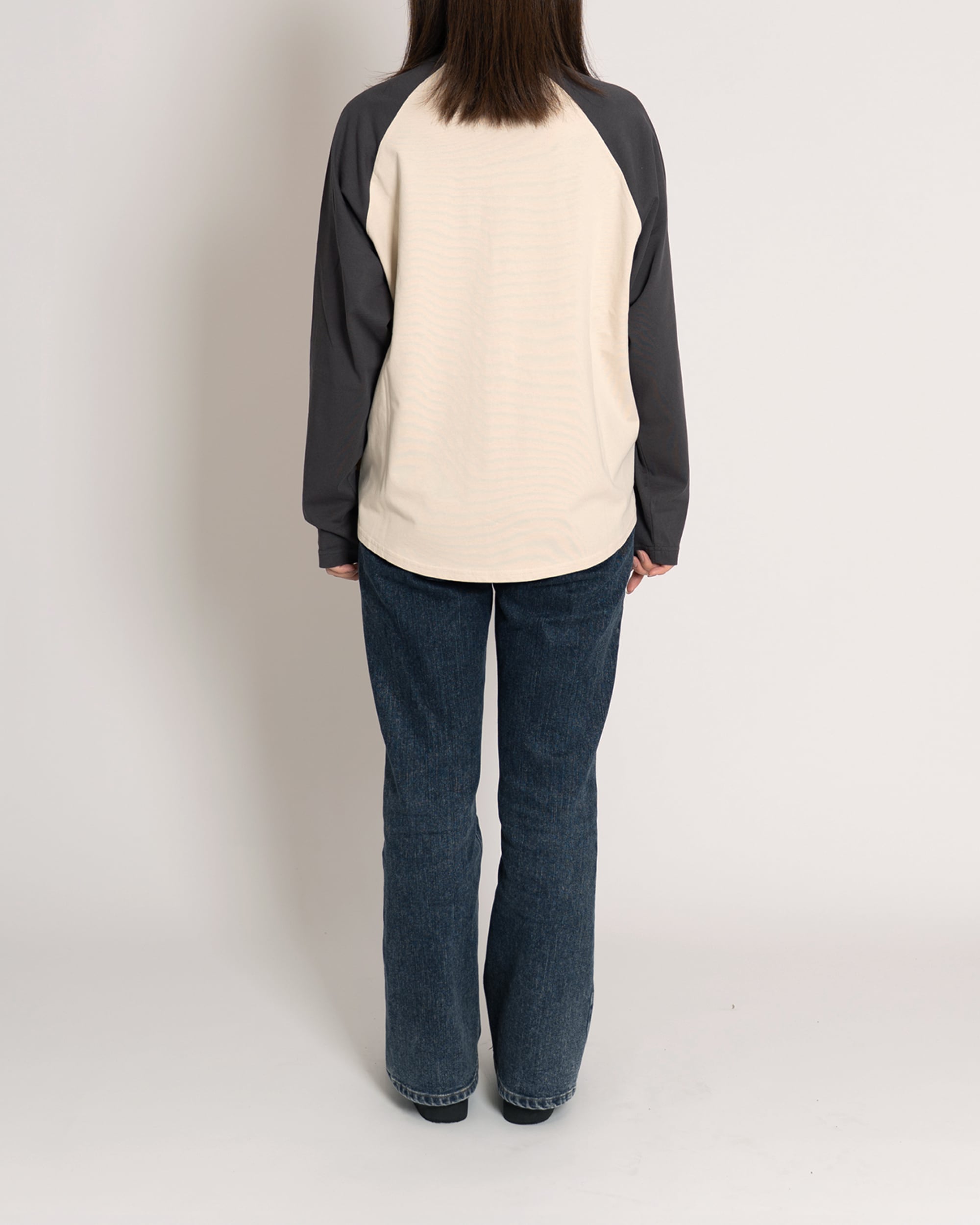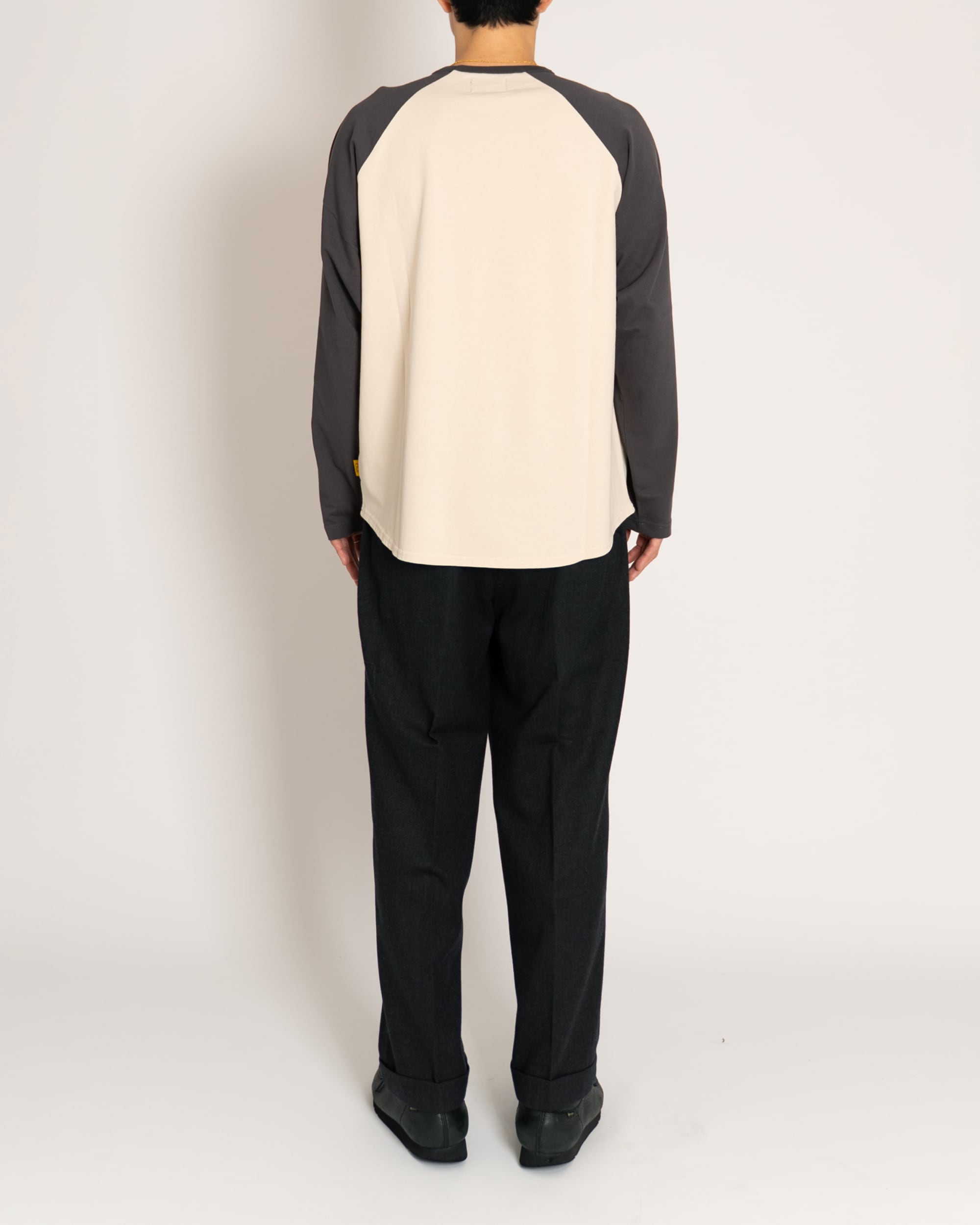 若干の光沢とハリのあるコットン素材を使用したラグランスリーブ仕様のロングスリーブTシャツ。