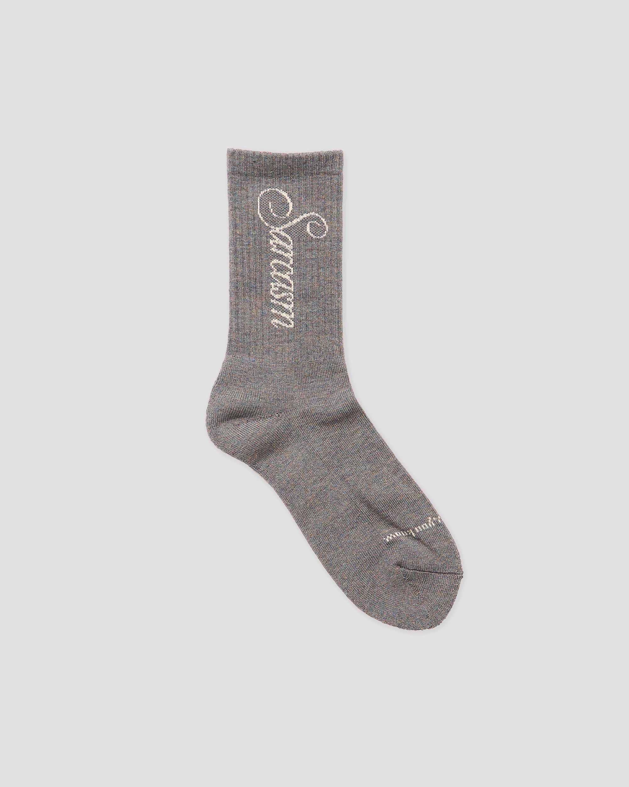 杢柄のボディのサイドにスクリプトロゴがデザインされたソックス。