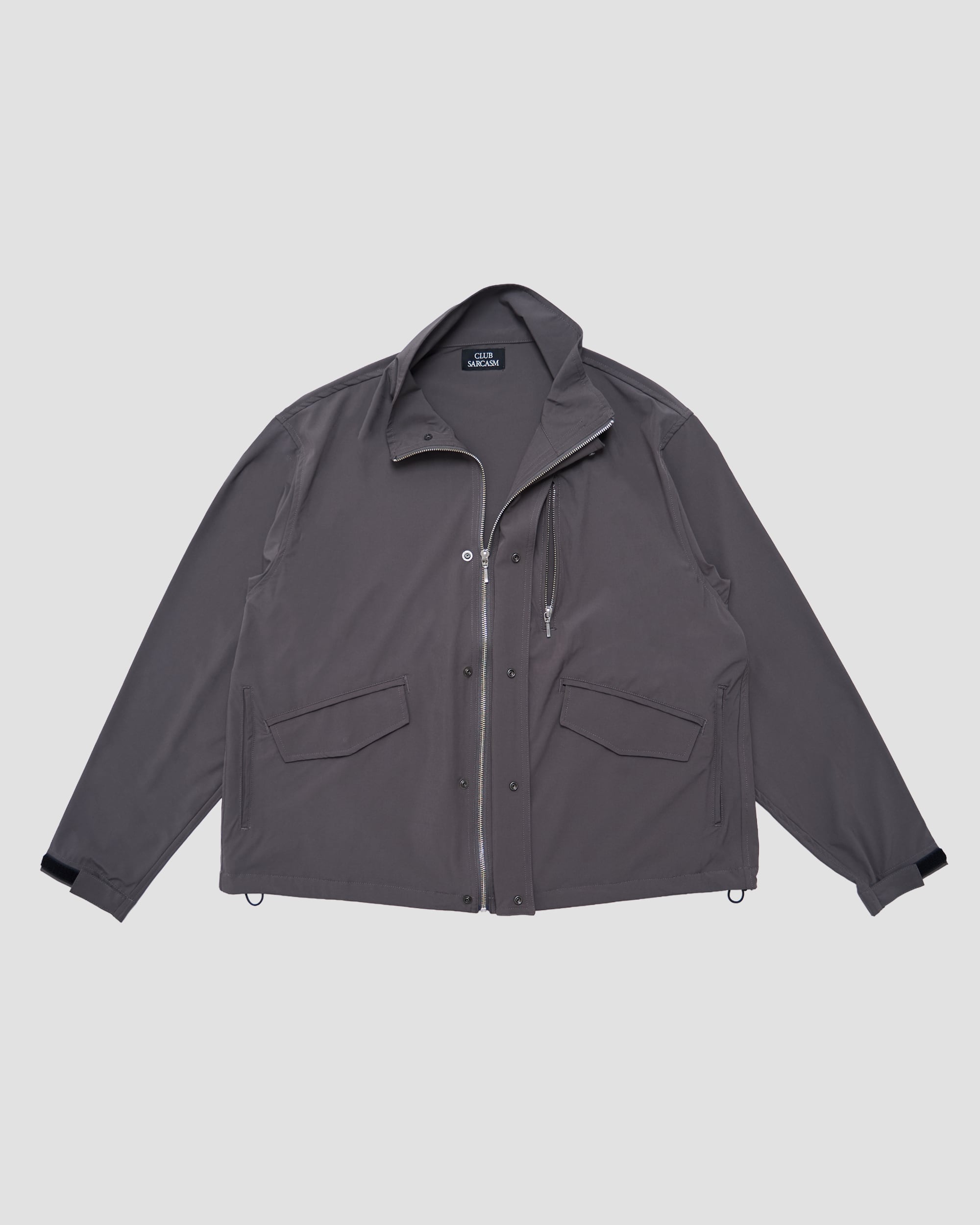 前立てはミニマルな比翼仕立てにし、胸元にはシルバーのジップポケットを配置。