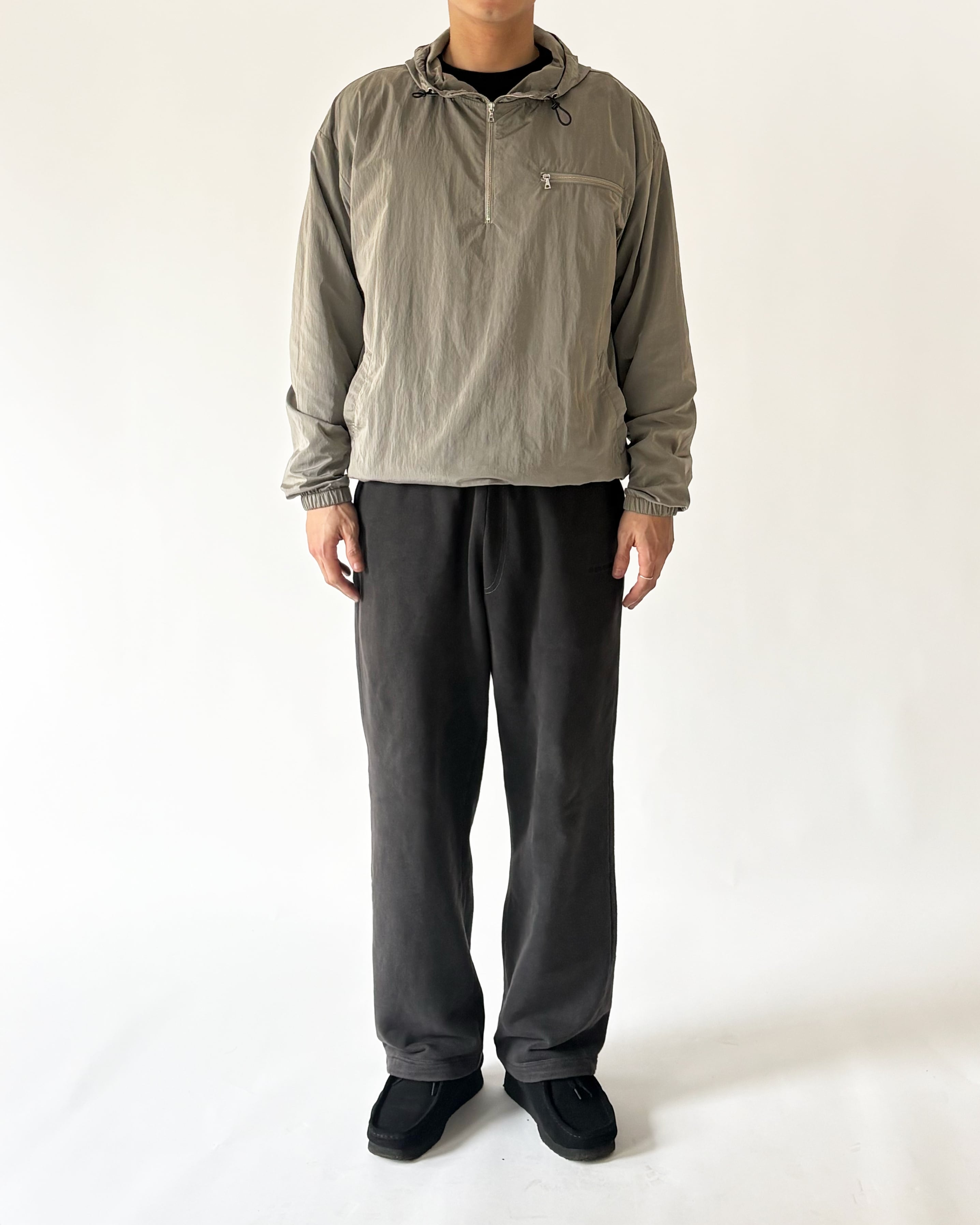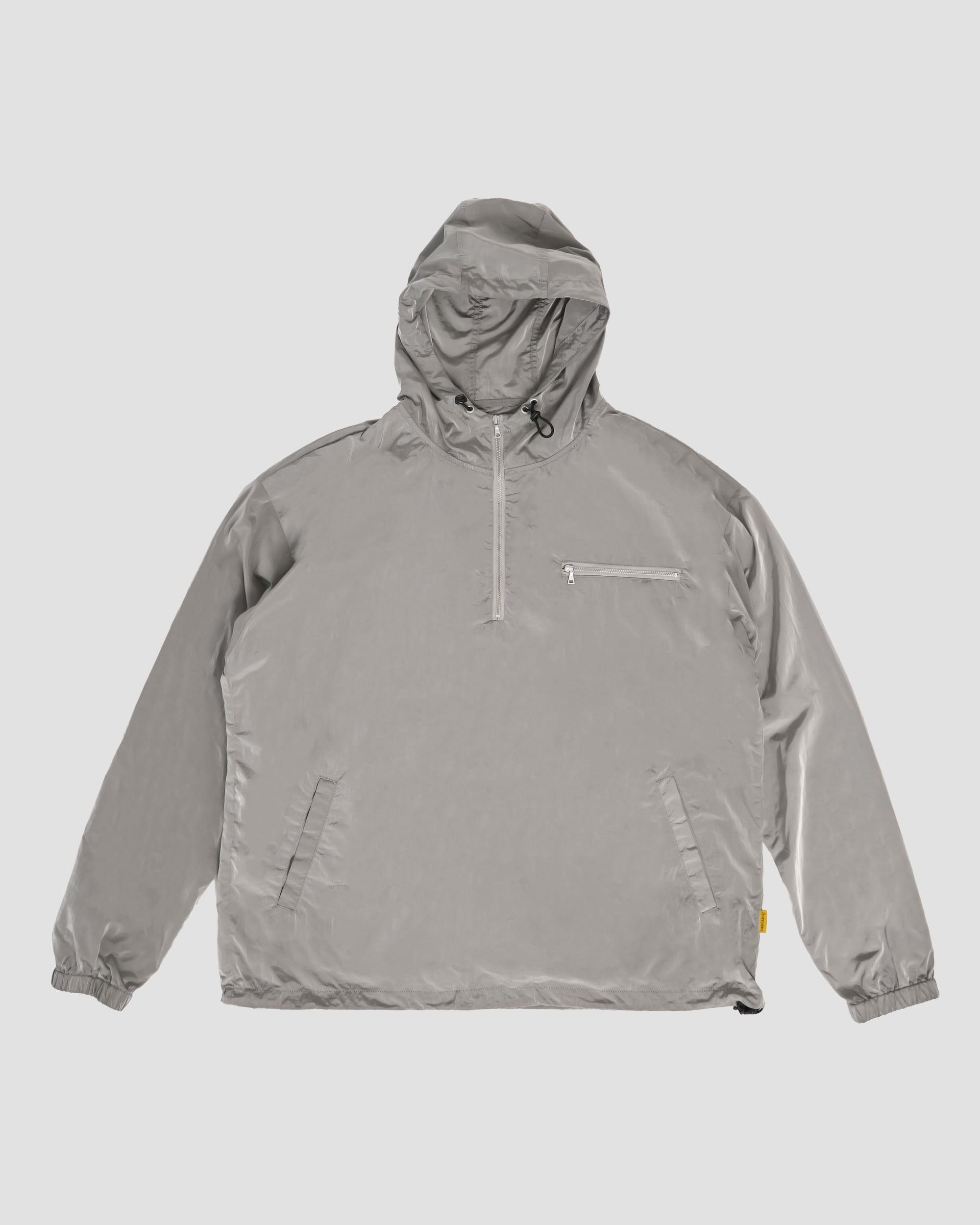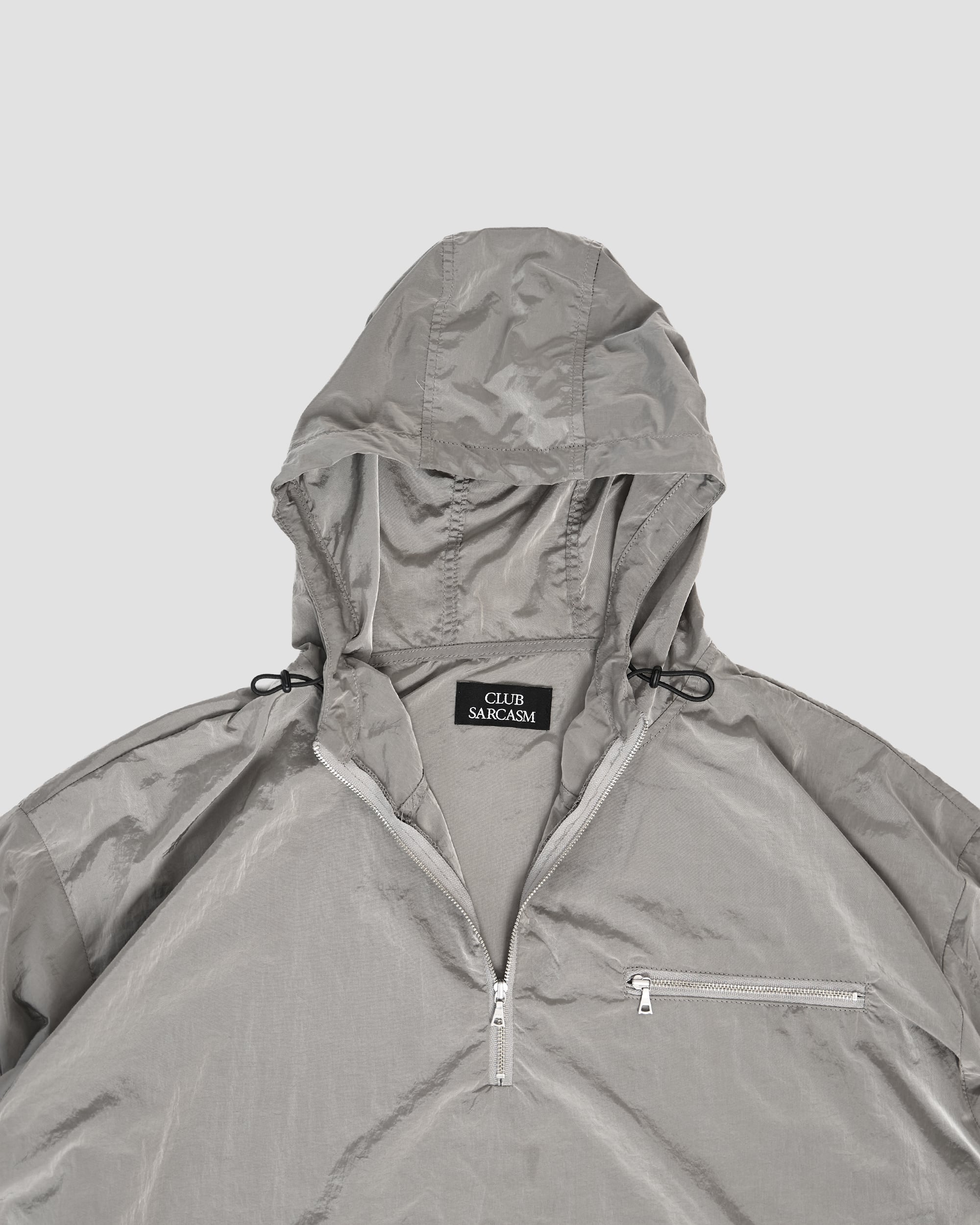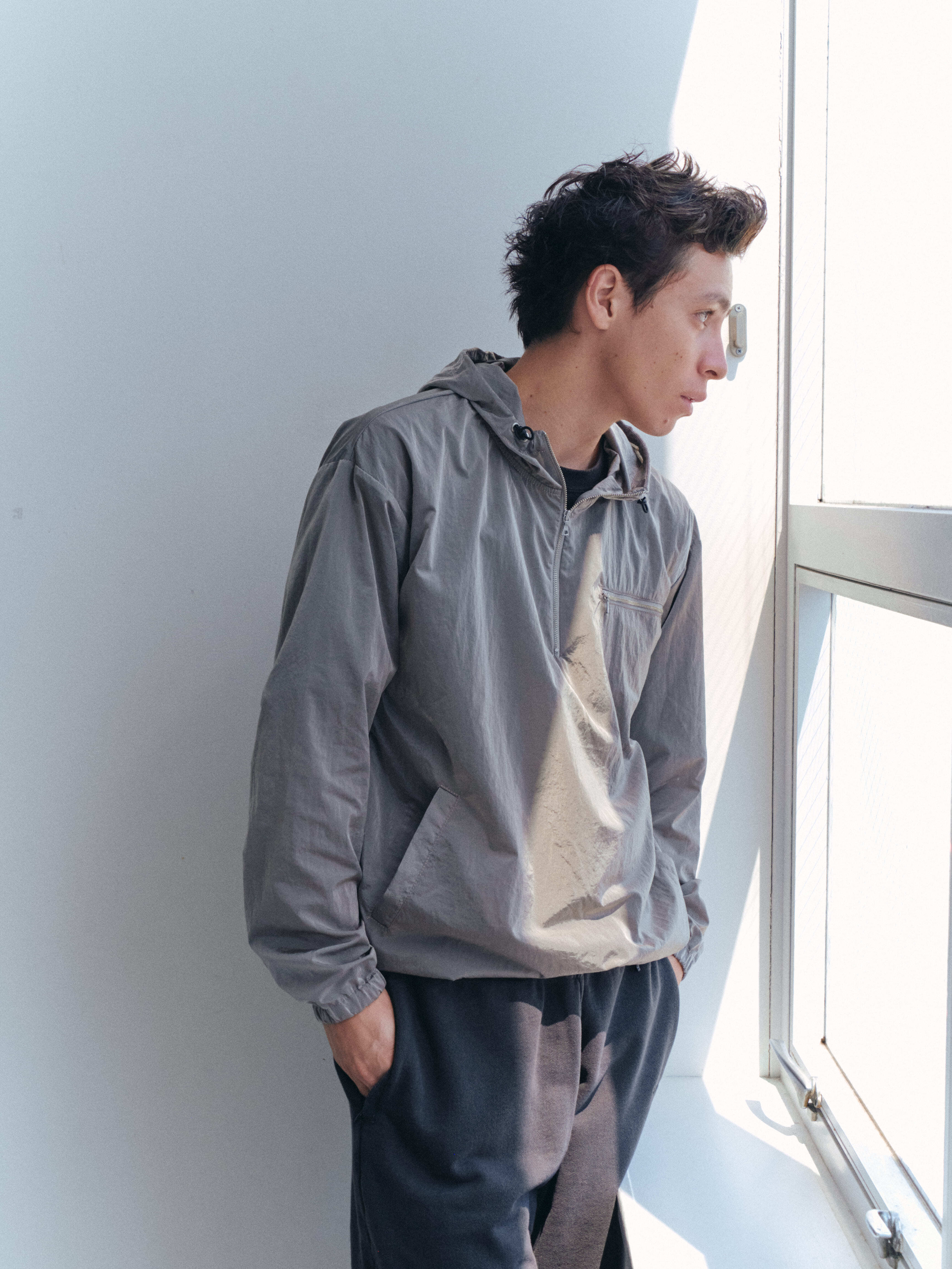 光沢がありながらシワ感を残したメタルナイロン素材を採用したハーフジップアノラック。