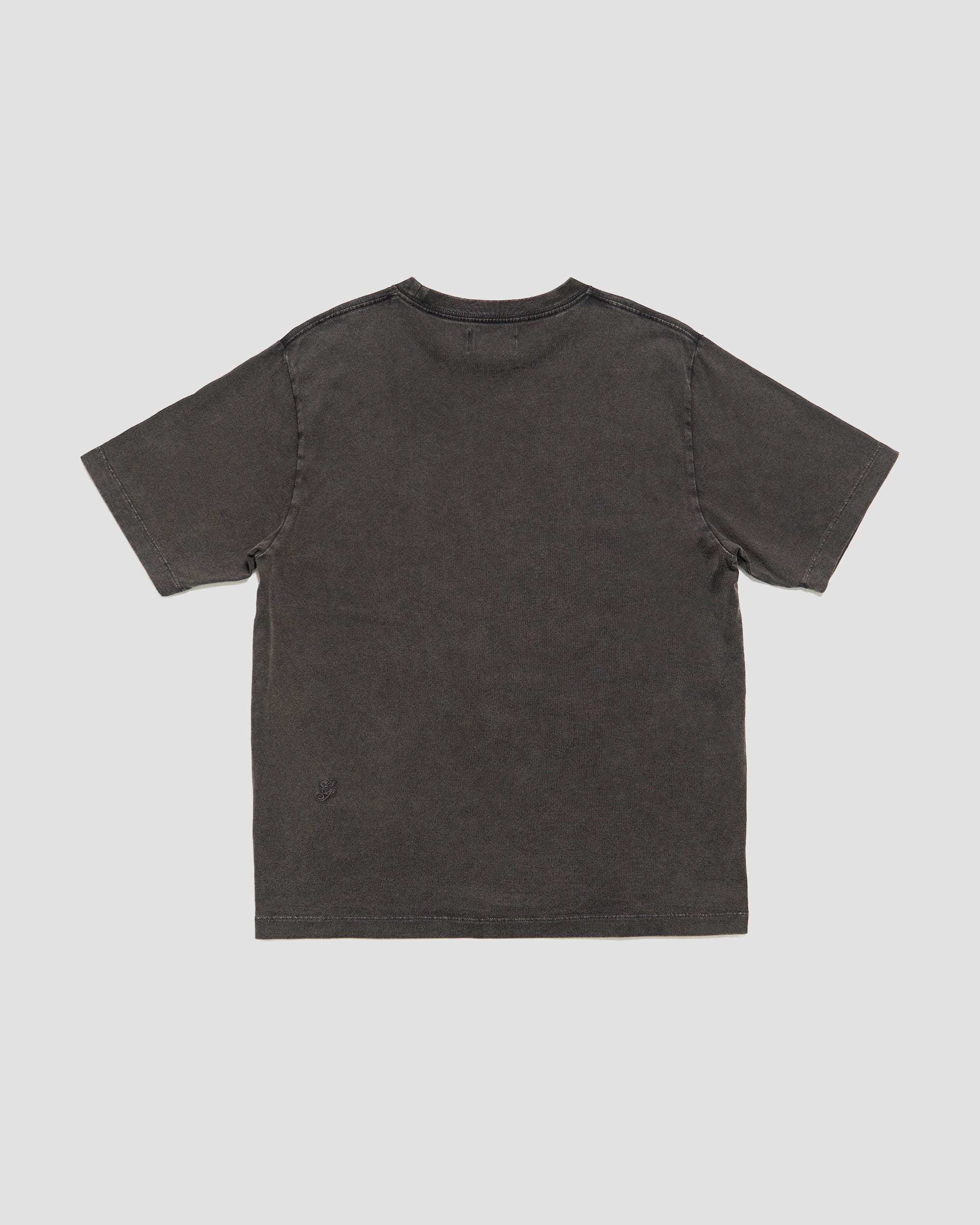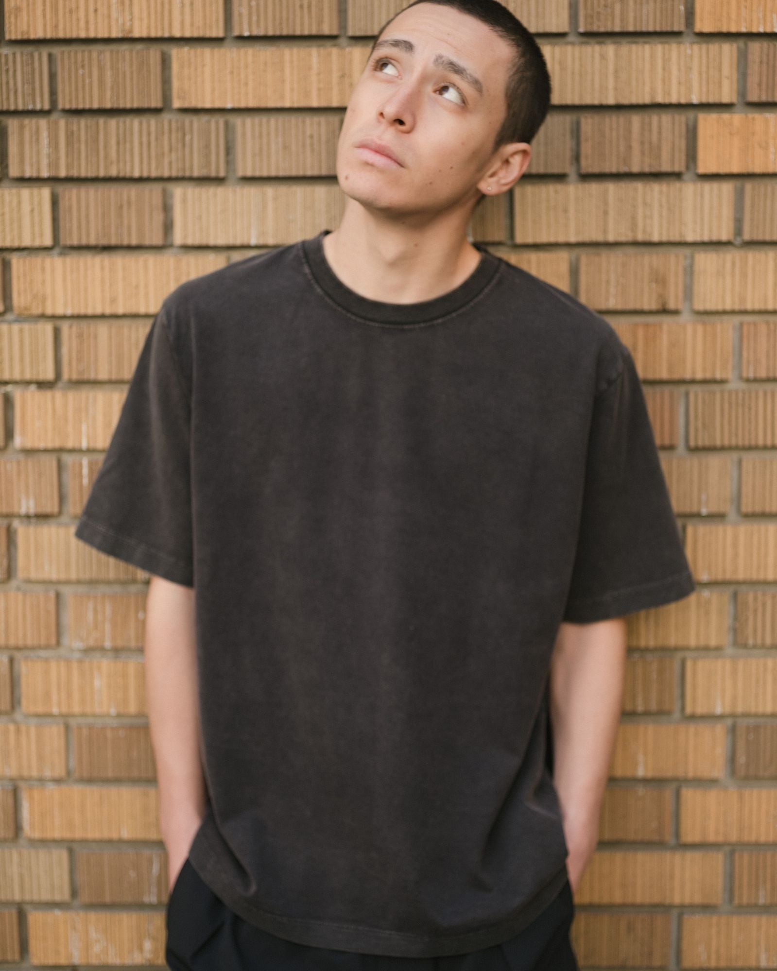 一度製品染めを施した後、水量と薬剤の使用を抑えた洗い工程を重ねることで、奥行きのある色味と自然なムラ感を引き出したTシャツ。