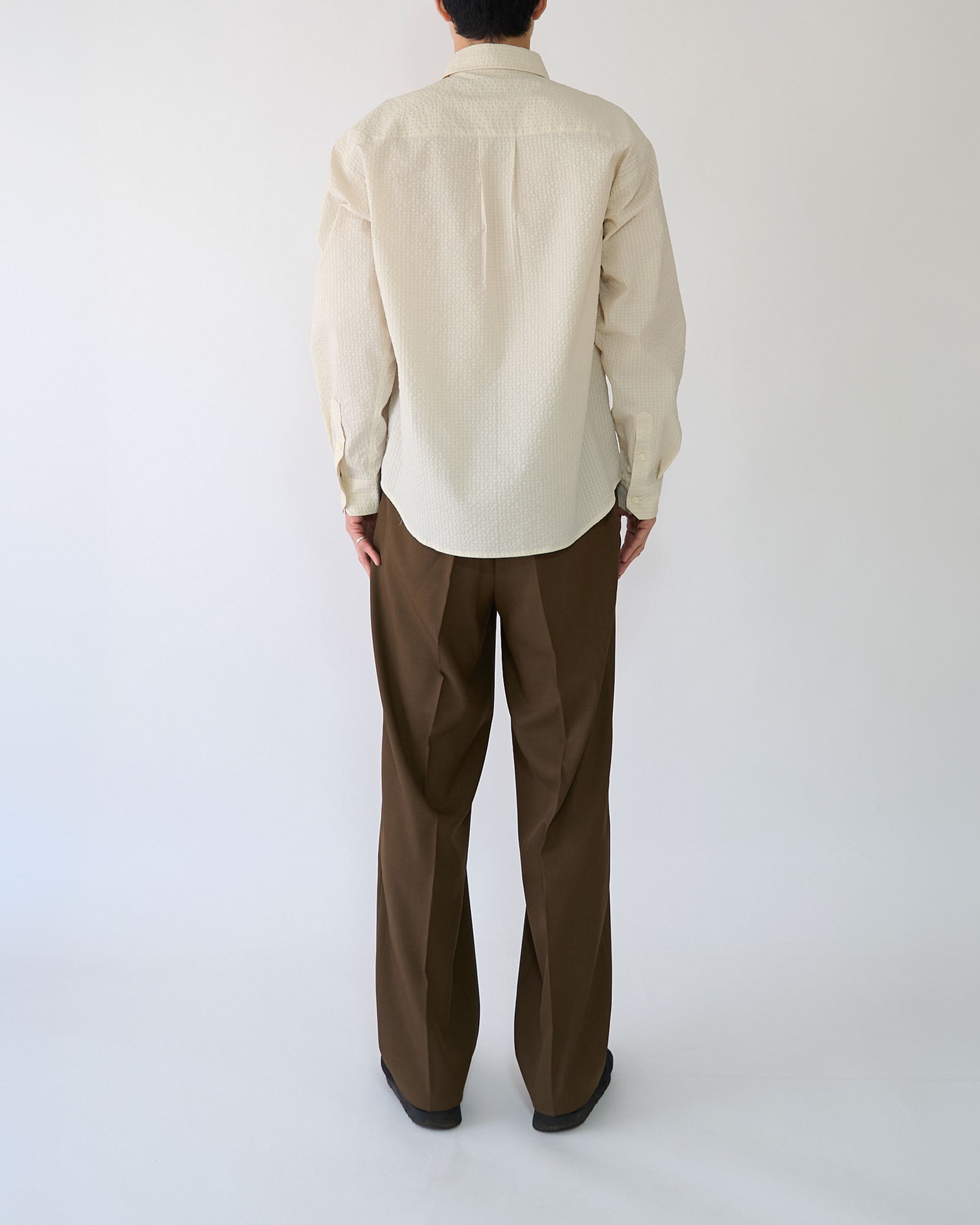 やや大きめに設計した襟が全体のバランスを引き締め、シャツでありながら軽いアウター感覚でも着用できる一着に仕上げています。